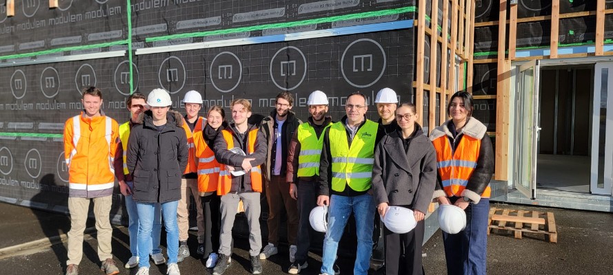 Chapitre 1 : à l 'usine ! Les étudiants de 5 -ème année Génie Civil de l'INSA Toulouse ont rendu visite à l'usine ModuleM à la Magdeleine sur Tarn : un des acteurs de la construction hors-site de notre région. Son directeur, Cyril Moussard, a accueilli les 10 étudiants du module MOBE ( Module Optionnel BIM Environnement) 2024-2025.